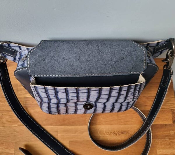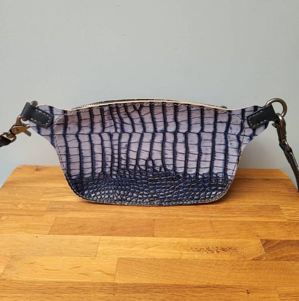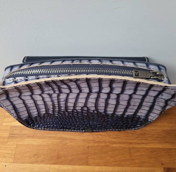 Deze tas is superhandig voor bijvoorbeeld je vakantie! Hij is met de hand genaaid van prachtig blauw leer met croco print gecombineerd met effen donkerblauw leer.