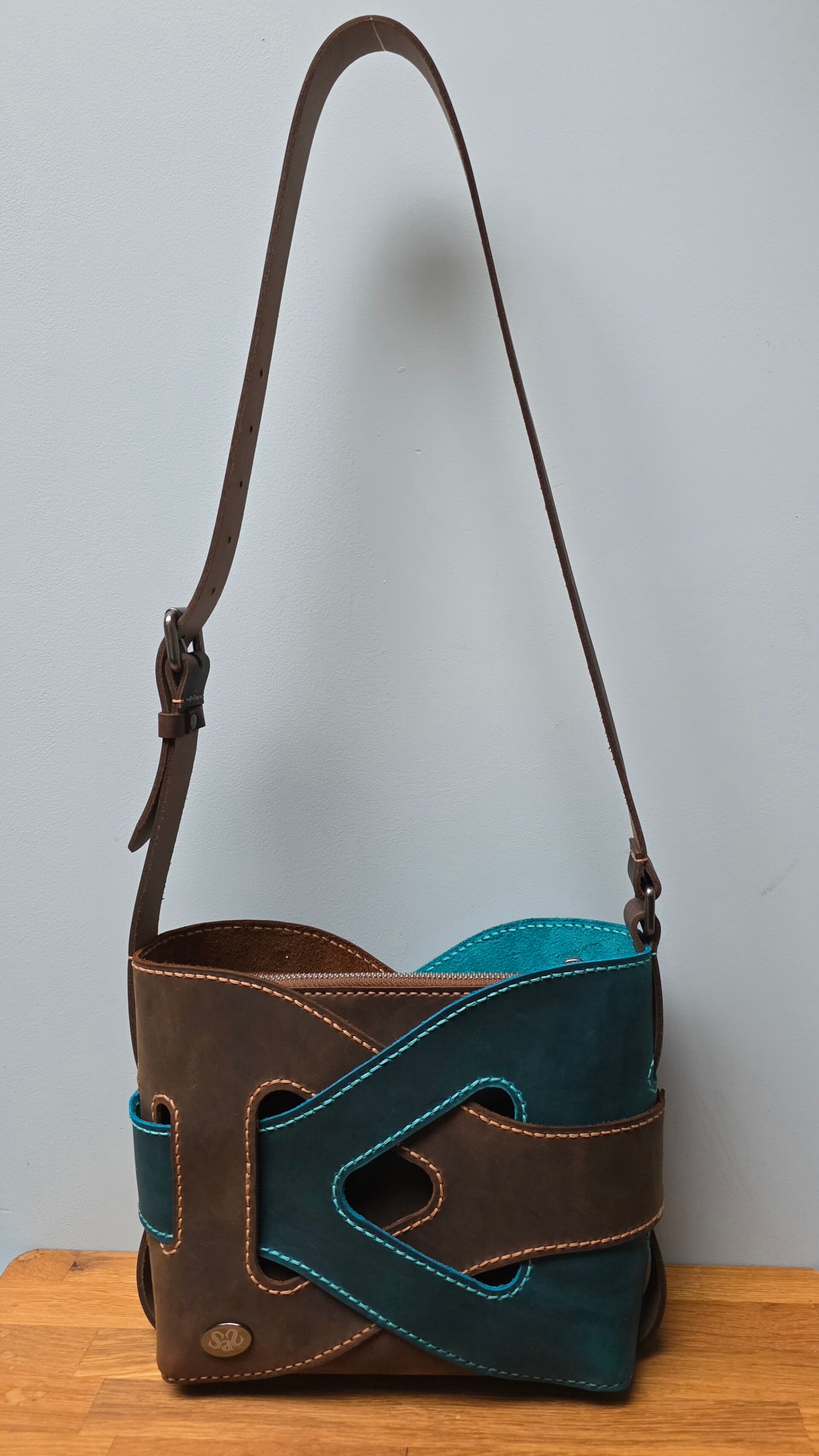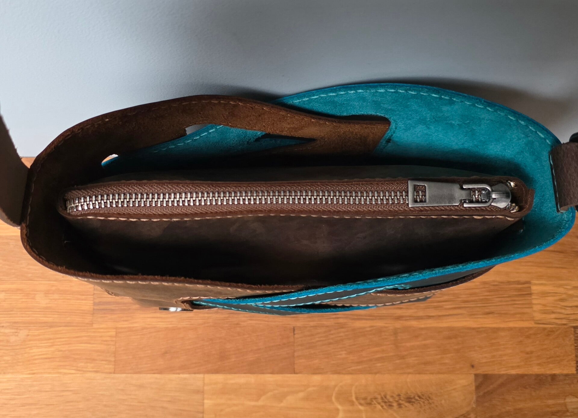 De buitenkant van de tas is gemaakt van bruin en turquoise crazy-horse leer wat in elkaar is gevlochten. Crazy-horse leer wordt met de dag mooier!