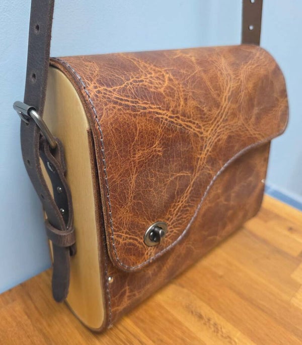 Levendig bruin leer, donkerbruine voering, een verstelbaar tuigleren hengsel en binnenin twee afneembare sleutelhangers. Afgewerkt met een stoere draaisluiting.